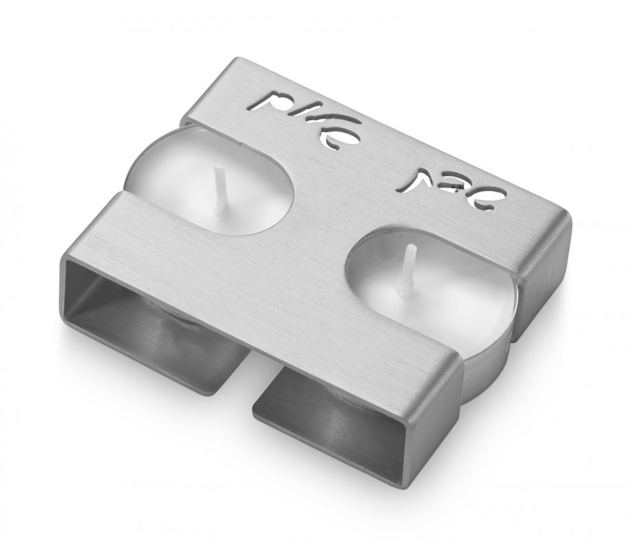Perfect if you are looking for space-saving Shabbat candle holders for the home or for travelling. Tea lights fit neatly into the silver colored brushed aluminum square candle holder. In the Adi Sidler hallmark minimalist design, its striking feature is a cutout Shabbat Shalom at the top. Made in Israel.