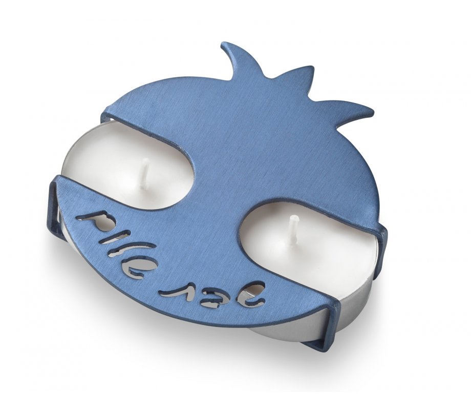 A delightful gift for anyone who will be away from home over Shabbat. Elegantly convenient, you will love to welcome Shabbat using this turquoise colored brushed aluminum candlesticks holder - pomegranate shaped with "Shabbat Shalom" cutout at the base. Comes with two tea lights ready to use.