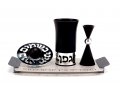 An exclusive Avner Agayof item that will match your room décor, enhance your Judaica collection and add an unforgettable touch to your havdalah ceremony. On the elegant aluminum tray, etched with words from the havdalah recitation, are three items all colored a dramatic eye-catching jet black: wine cup with a silver band at the base featuring extract from the blessing, uniquely shaped spice holder also with words from the blessing and finally, a candle holder, conical shaped with a silver ball in the center.