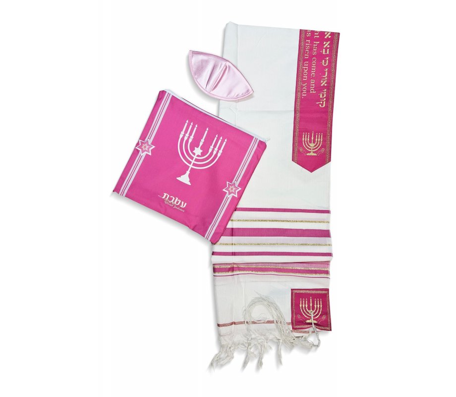This beautifully designed acrylic prayer shawl, designed for draping over your shoulders, is lightweight and comfortable. Pink and gold stripes are highlighted with a square at each corner, decorated with a glittering menorah and palms outstretched in prayer. The theme continues at the neck piece where the Arise and shine for your light has come verse from Isaiah is boldly displayed.
