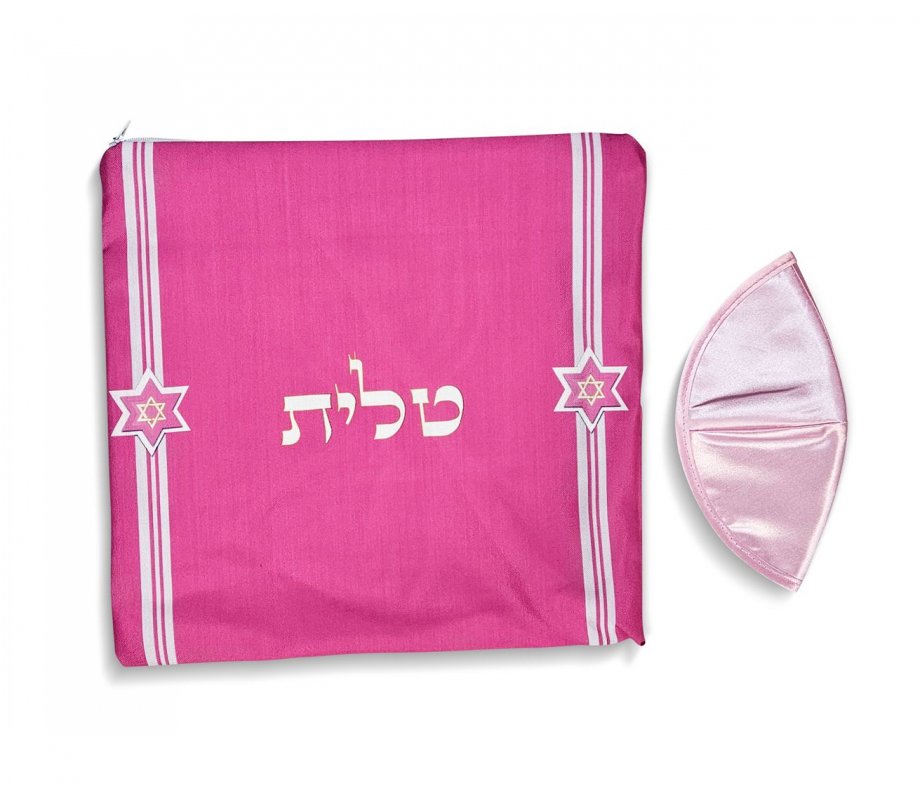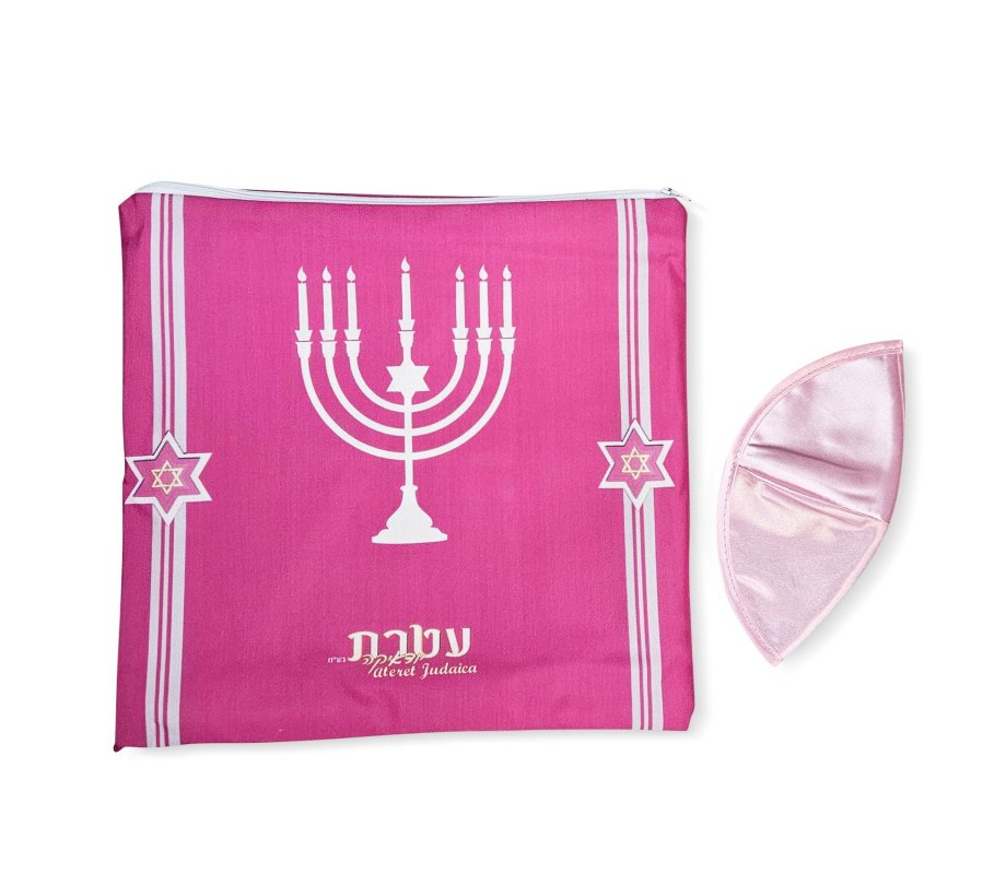 This tallit comes with a satin kippah. Everything packs neatly into a small matching bag.