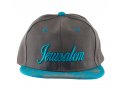 For all who love Jerusalem – a low-cost six paneled gray and turquoise cotton baseball cap displaying a turquoise "Jerusalem" embroidered at the front in bold cursive font. This matches the button at the top and the ventilating eyelets. The turquoise brim is decorated with a cheerful paint splatter design.