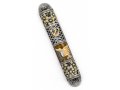 This metal mezuzah case expresses the timeless message of the peace dove. The enamel dove, clutching an olive branch, is displayed on a brown-bronze background. Above it, is an elegant shin on an open crisscross design. At the top and at the base are bronze colored flowers studded with gleaming stones.