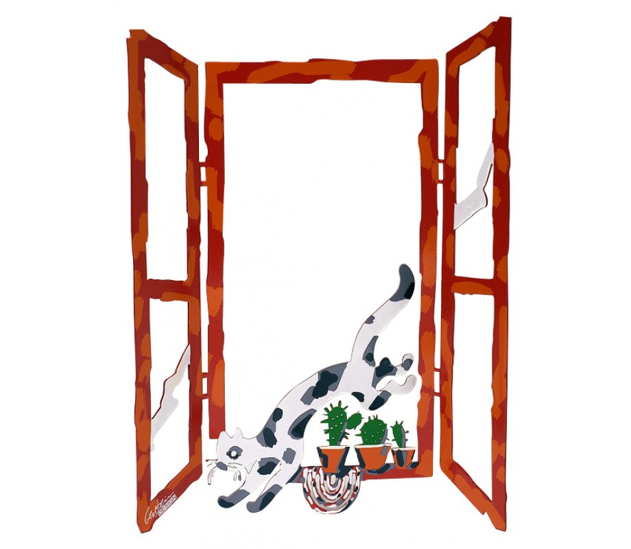 David Gerstein Free Standing Open Window Cat and Cactus Sculpture - Back Home