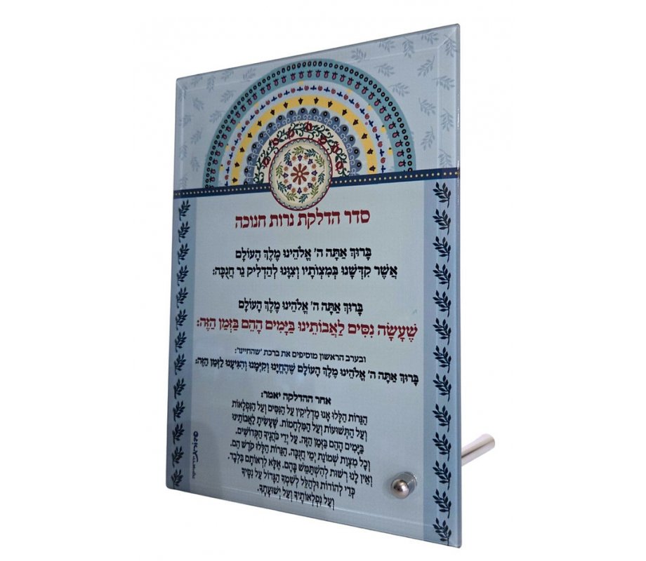 Illuminate your Chanukah traditions with this artistic glass blessing stand from Dorit Judaica. Featuring an intricate pomegranate mandala, the design blends rich symbolism with vibrant detail, creating a striking focal point for your holiday setup. The glass panel displays the Menorah-lighting blessings in a clean, easy-to-read format, adding both beauty and convenience.