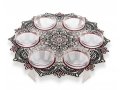 This magnificent Seder Plate from Dorit Judaica expresses superb elegance. Blending tradition and contemporary art, it features a fluted rim and a decorative floral mandala design in black and maroon colors. Around are glass bowls for the ritual foods with the appropriate names alongside. Small feet on the reverse give a finishing touch of dignity.