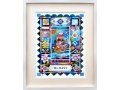 This colorful wall hanging, hand-finished by talented artist Dvora Black gives a fun look at Noah’s Ark. Filled with color, it depicts the animals clambering on the ark with the sun and moon and Stars of David. Adding to the fun, is a colorful frame incorporating more whimsical images.