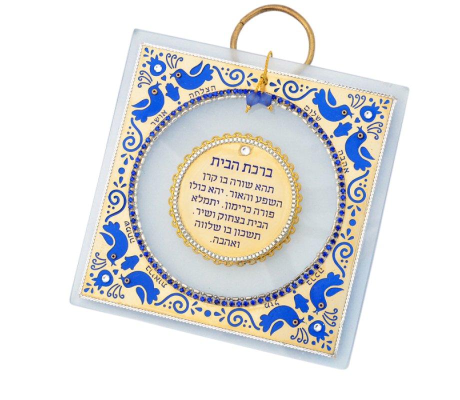 Ester Shahaf Glass Hebrew Home Blessing with Doves and Pomegranates