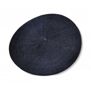 A comfortable knit woman's beret-snood in black. The snood stays on by means of an elastic thread within the rim of the snood, and can be tightened and loosened by means of a drawstring toggle on the elastic.