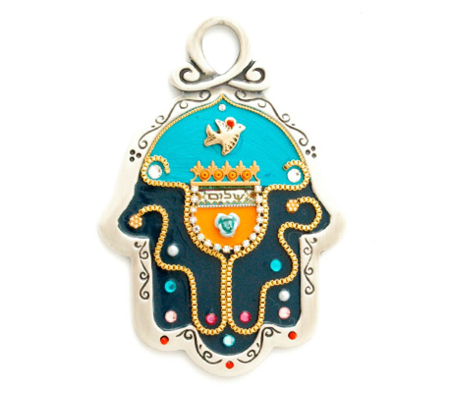 The backdrop for this pewter Hamsa is midnight black and royal blue with a dove of peace on the upper part. In the center is a Kiddush cup design with the word Shalom in Hebrew, accentuated by hand applied metal and crystals.
