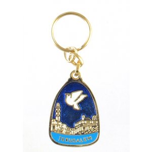 You will love this low-cost keychain from Israel as a gift for yourself or anyone dear to you. In an oval gold frame, the well-known Israeli camel is painted in gold on a white and blue background. At the base is written "JERUSALEM" in bold letters. On the reverse is engraved, "Souvenir from Holy Land".