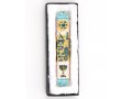 This glittering mezuzah case is the perfect expression of pride in Jewish identity. On a glowing off-white background is a gold and green Star of David, Seven Branch Menorah and Jerusalem images decorated with gleaming stones.