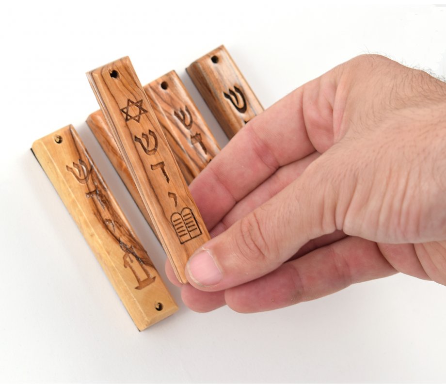 Set of Five Olive Wood Mezuzah Cases with Judaic Symbols - 3.5" Length