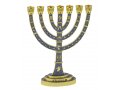 This elegant gray enamel on the gold color metal of the 7-branch Menorah features a decorative floral and geometrical decorations with Judaic motifs and the symbols of the Twelve Tribes of Israel. The 3 tier oval base carrying the "Jerusalem" engraving adds an artistic dimension.