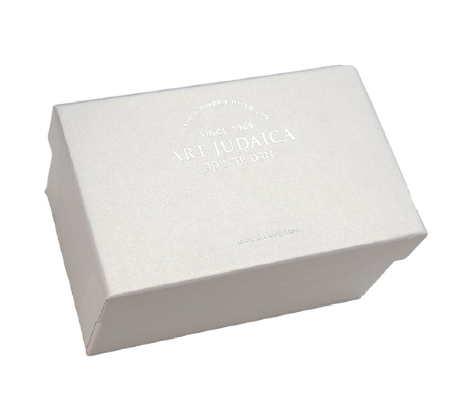 These square crystal glass candlesticks feature a shimmering gold-colored metal overlay with a detailed Jerusalem design, blending tradition with modern elegance. Ideal for Shabbat and holiday use, they also make a meaningful gift that brings the beauty of Jerusalem into the home.