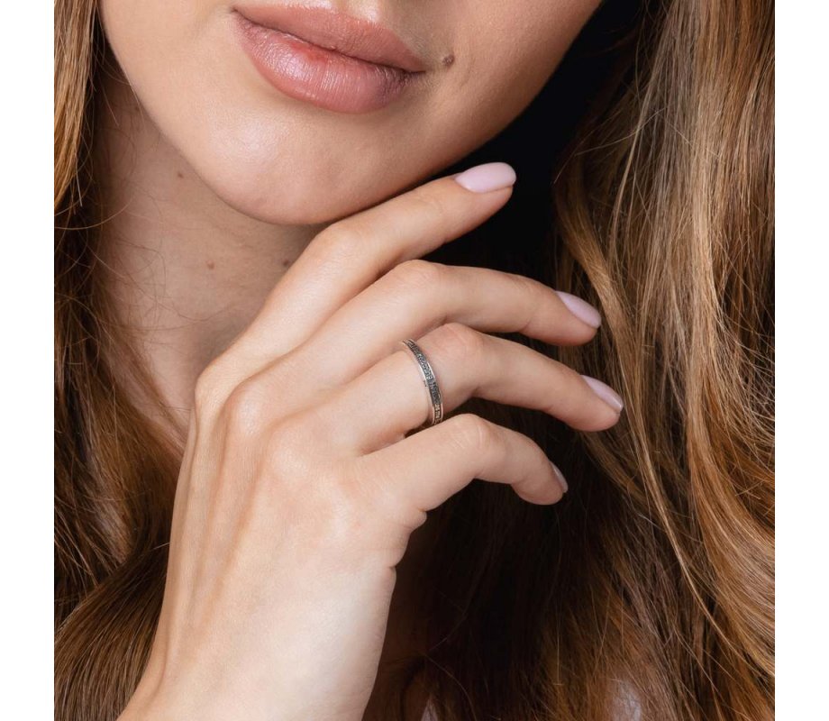 A ring of faith and blessing. Crafted from sterling silver and designed in Israel, it is decorated with a black oxidized band on which is engraved in English the Priestly blessing, recited by the Kohanim (descendants of priests). It says, "May G-d bless you and keep you. May G-d make His face shine on you and be gracious to you. May He lift up His face to you and give you peace." (Numbers 6:24-26)
