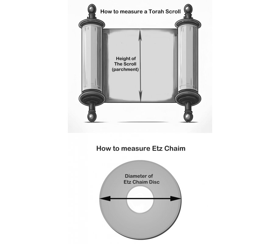 It would be helpful if you could provide us with the diameter of your Etz Chaim disc and the height of your current Torah mantle but it is not essential. Note - the illustrative diagram.