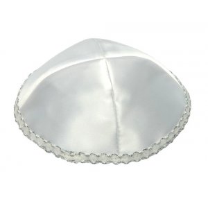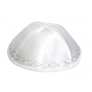 The Star of David, ultimate symbol of Jewish faith and identity, beautifully adorns this white satin kippah. The classic interlocking double triangles are formed with elegant white and silver trimming stitched on to the top of the kippah.