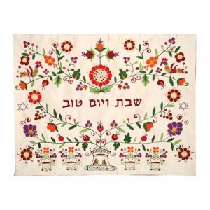 The delicate harmonizing colors on this cotton-polyster challah cover make it a visual delight for your Shabbat or Holiday table. Made from quality cotton polyester, it is decorated with a machine embroidered grapevine and flower design. and “Shabbat veYom Tov” in the center