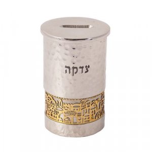 This absolutely stunning cylinder Tzedakah box will add depth and meaning to the mitzvah of giving charity. The silver color glows with a hammered finish and at the base, a gleaming silver metal band adds beauty with an intricate Jerusalem cutout design that incorporates domes, arches and palms. The word "tzedakah" is written in Hebrew in the center.