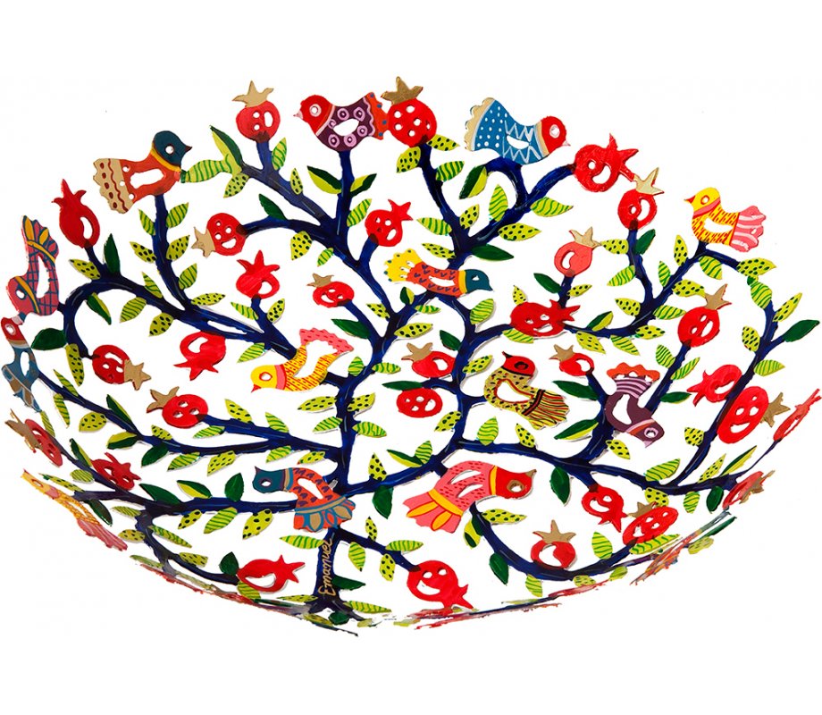 Yair Emanuel Laser Cut Hand Painted Colorful Bowl - Birds and Pomegranates