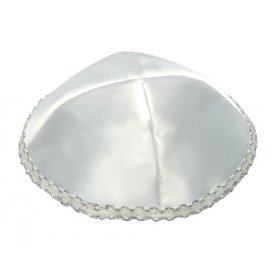 The satin Kippah is worn at festive occasions such as Jewish weddings or for prayer services. Some are plain white with a metallic silver thread border, and others have a decorative Star of David or Mazal Tov design. Others sport a Jerusalem theme border design in gold and silver threads. The plain white Kippot are available to order in bulk, with gold or silver letter personalization to commemorate a wedding or Bar Mitzvah, to be distributed among the guests as a distinctive memento. These Kippot are classic and dignified, and are of superior quality.