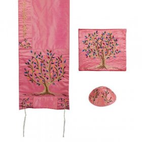 Yair has given a subtle twist to the classic stripe design on a white background. He has reproduced the stripes in lively colors, repeating the theme at the corners and on the Atarah. For the more adventurous there are blue, maroon and pink tallitot, ablaze with magnificent embroidery, depicting floral themes or traditional Judaica motifs. The artist’s deep abiding attachment to Jerusalem is reflected in the variety of his images of the holy city. One of Emanuel’s most striking tallitot is the dramatic silk Tallit featuring a colorful Tree of Life design laden with fruitful pomegranates on a deep pink background.
