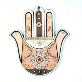 Ester has embellished the center of the Hamsa hand with various decorative elements, flowers, fish, Star of David or simply a stunning assembly of gleaming stones forming a magnificent carpet of color and design.