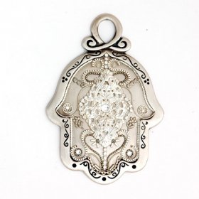 The Hamsa is an ancient Oriental amulet, reputed to have special powers of protection from the Evil Eye. It also brings with it positive energy and provides good luck blessings. The word Hamsa is connected to the Hebrew word “Hamesh” - five, referring to the Five Books of Moshes. The Hamsa hand is also known as the Hand of Miriam. It was in the merit of Miriam, sister of Moses and Aharon, that the Jewish People were provided with water in the desert. So, her name came to be associated with blessing and protection. A fish design on Hamsa strengthens the protection since fish live in water, where they are immune to the powers of the Evil Eye. The usual display of the Hamsa is three extended fingers in the middle and a curved thumb or pinky finger on either side.