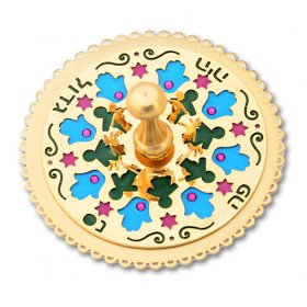 Ester Shahaf’s dreidels are striking for their bright colors, sparkling beads and pure crystals based on pewter, silver or gold plated brass. Using a skilled etching technique, she cuts out shapes of birds, Hamsas or dancing children, giving the dreidel a fresh vibrant look of life. Any of her decorative dreidels will bring light and joy to your home.