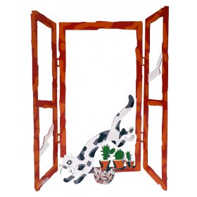 The shutters on the windows of his series are the old-fashioned Israeli style that are today slowly becoming obsolete. Cats and cactus plants are re-occurring figures in these window sculptures. Gerstein is commenting on the Israeli scene especially in Jerusalem, where cats are in abundance and can be seen in the evenings prowling the streets. The thorny cactus plant, also depicted in a number of sculptures, is an Israeli motif. It is strong and durable and has the ability to survive in the most difficult conditions – a reflection on the Israeli personality.