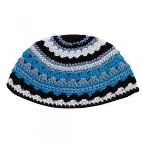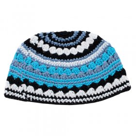 Frik Kippah Thick Crocheted Weave of Black, White and Shades of Blue StripesSize: 9.4"$6.42 -